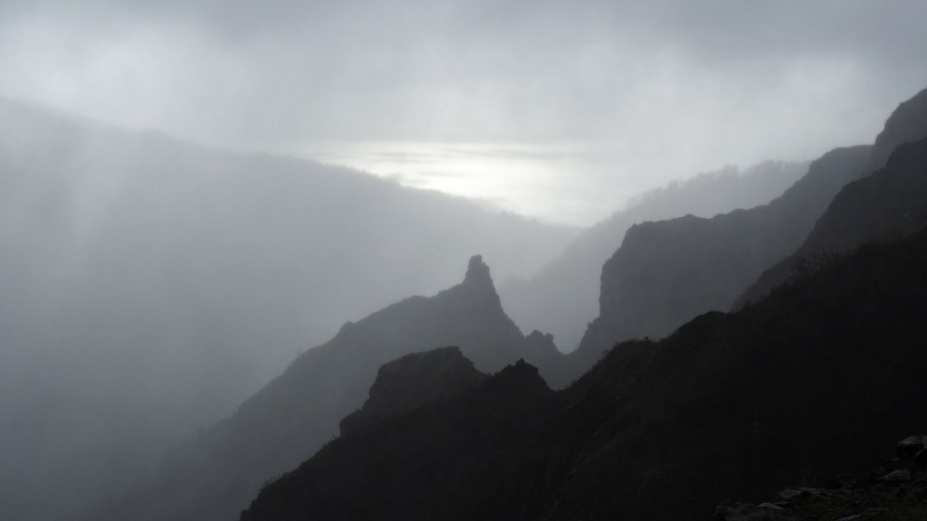 I didn’t know what to expect from an island out in the middle of the Atlantic. I knew I would find beauty, but I didn’t expect wilderness like this. One day, a friend and I hiked towards Pico Grande. We caught our Uber in Funchal, when the air was mild and gentle, almost like spring. But when the Uber dropped us at the start of the PR12 trail, the weather changed in an instant. Wind and rain came rushing in, loud and sudden. It felt like stepping into another world. All the way up, the gusts followed us, like a constant voice guiding us through the narrow paths. We walked inside the clouds, around 1,300 metres high, and the mountains appeared and disappeared in the mist. Water oozed from the rock and ran down the slopes, as if the island itself was still alive and breathing.